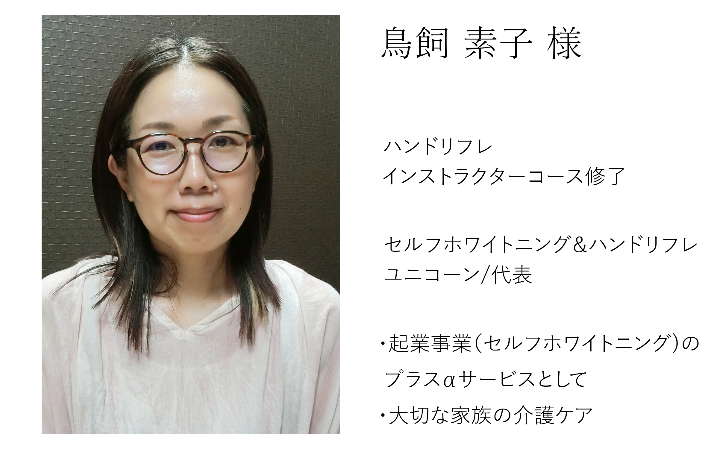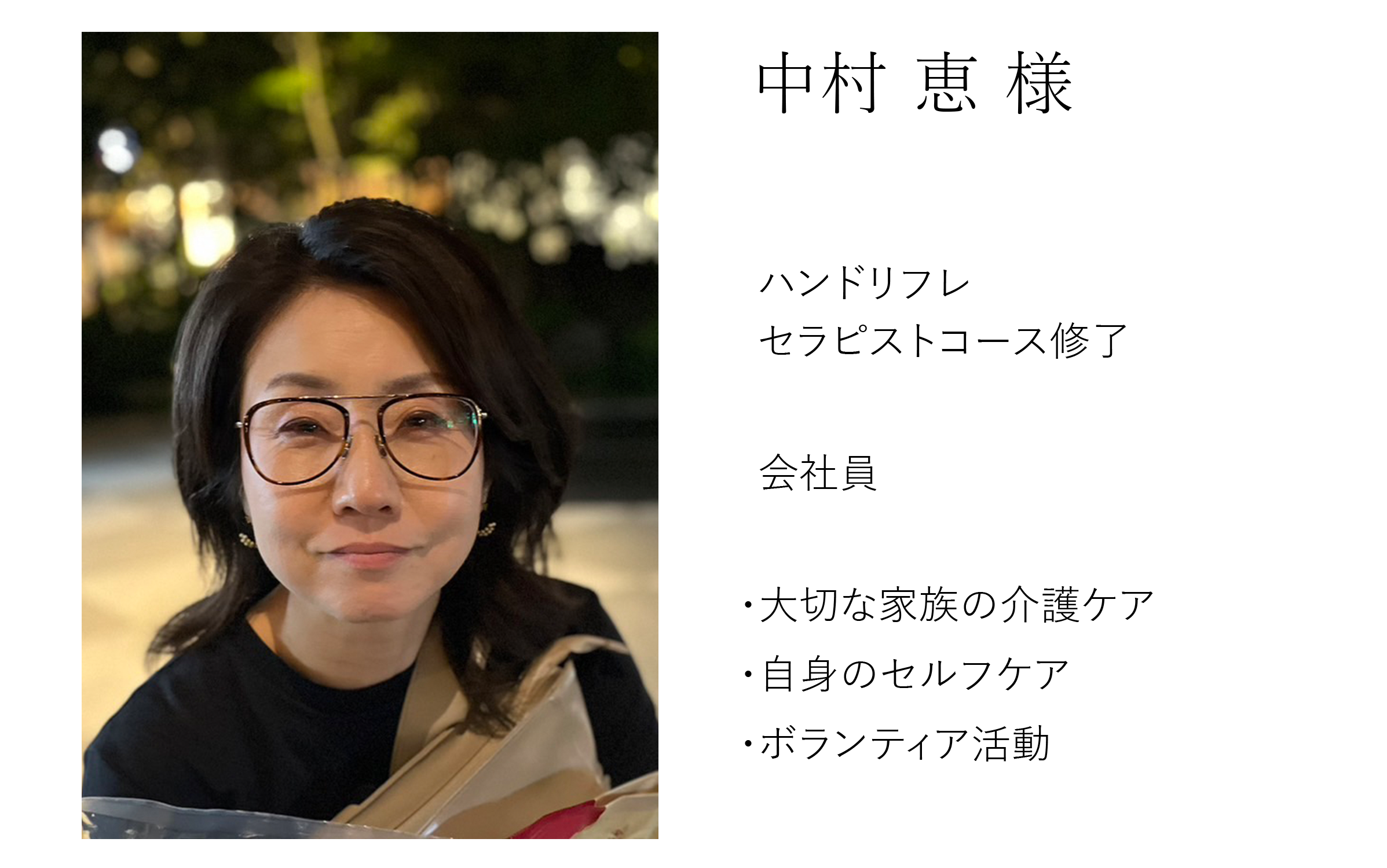 身近な人に対し、「本音を話せない」「触れ合えない」「大切だと伝えられない」状況を何とか改善したいと思いハンドリフレを始めました。何を準備するわけでもなく、気軽にできることが何よりの魅力ですが、施術を通して効果も侮れないと感じるようになりました。