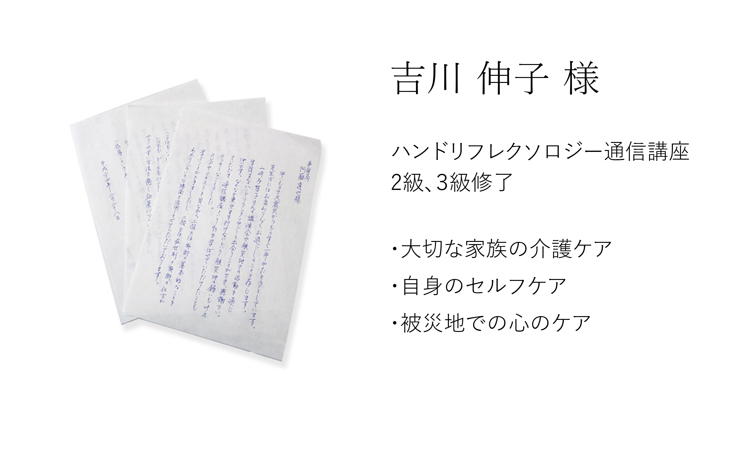 例えば高齢化した身内やメンタルの疲れている知人、避難所の方に体一つで何かできないかと思った時、ハンドリフレは気軽に気負わずにできる、また安心を与えられる方法として最適なツールのひとつではないかと思います。これからの世の中にもっとハンドリフレの必要性が出てくるのではないかと実体験を通して感じています。